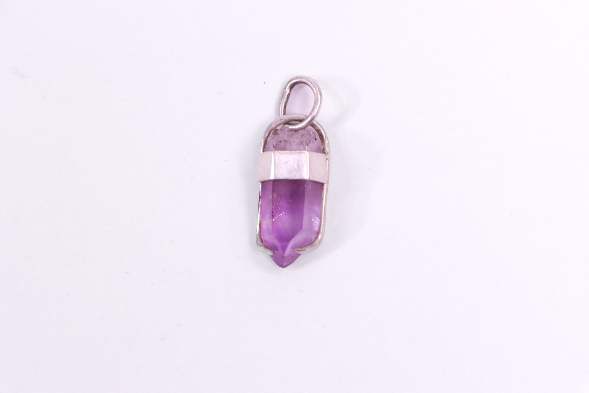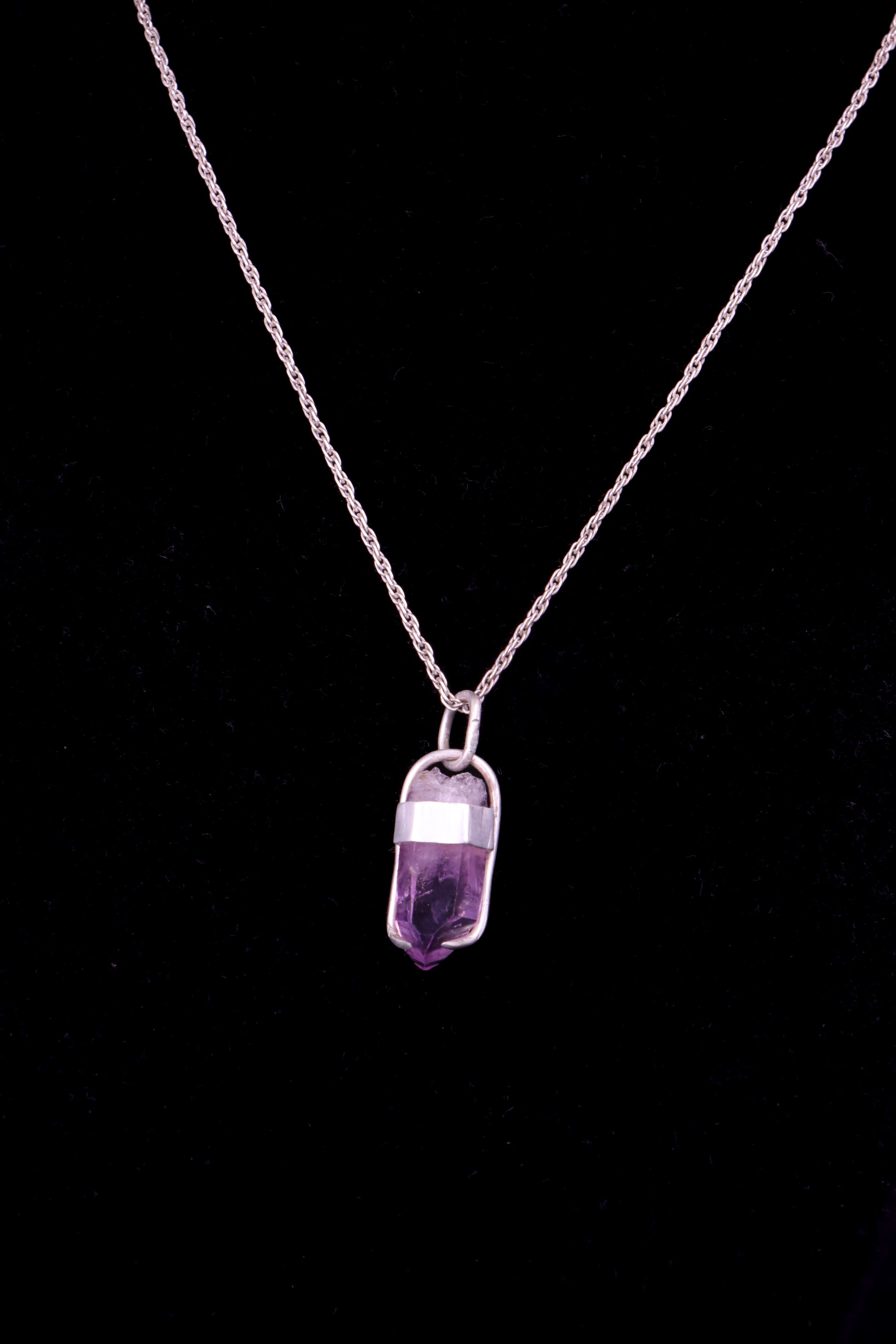 A raw Amethyst Crystal in a sterling silver claw set pendant.
