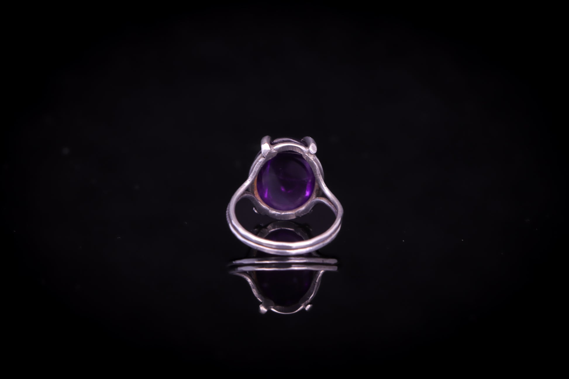 A dazzling oval Amethyst cabochon in a sterling silver claw setting. This ring is a size 7.