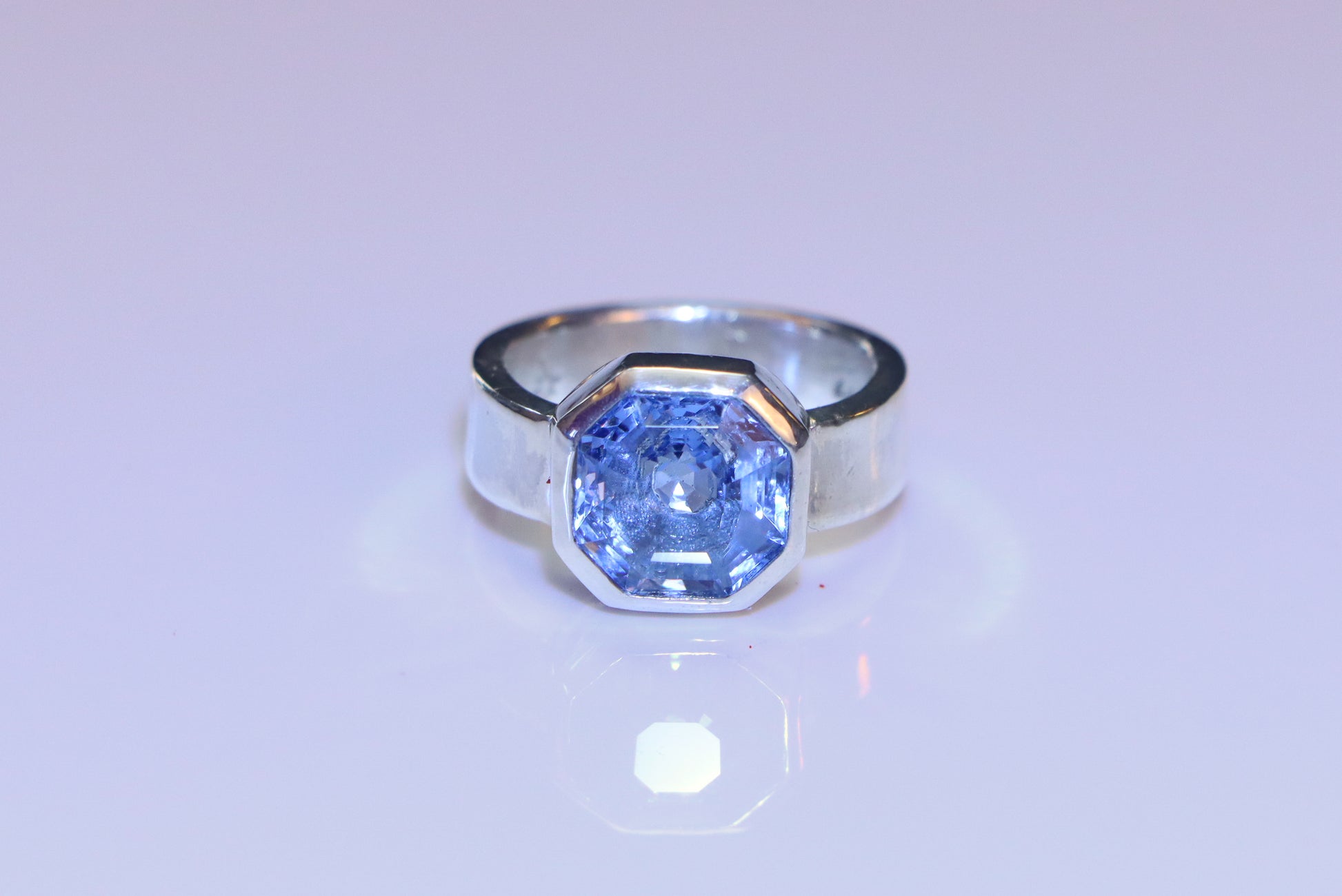A custom hand-carved London Blue Topaz ring cast in sterling silver.