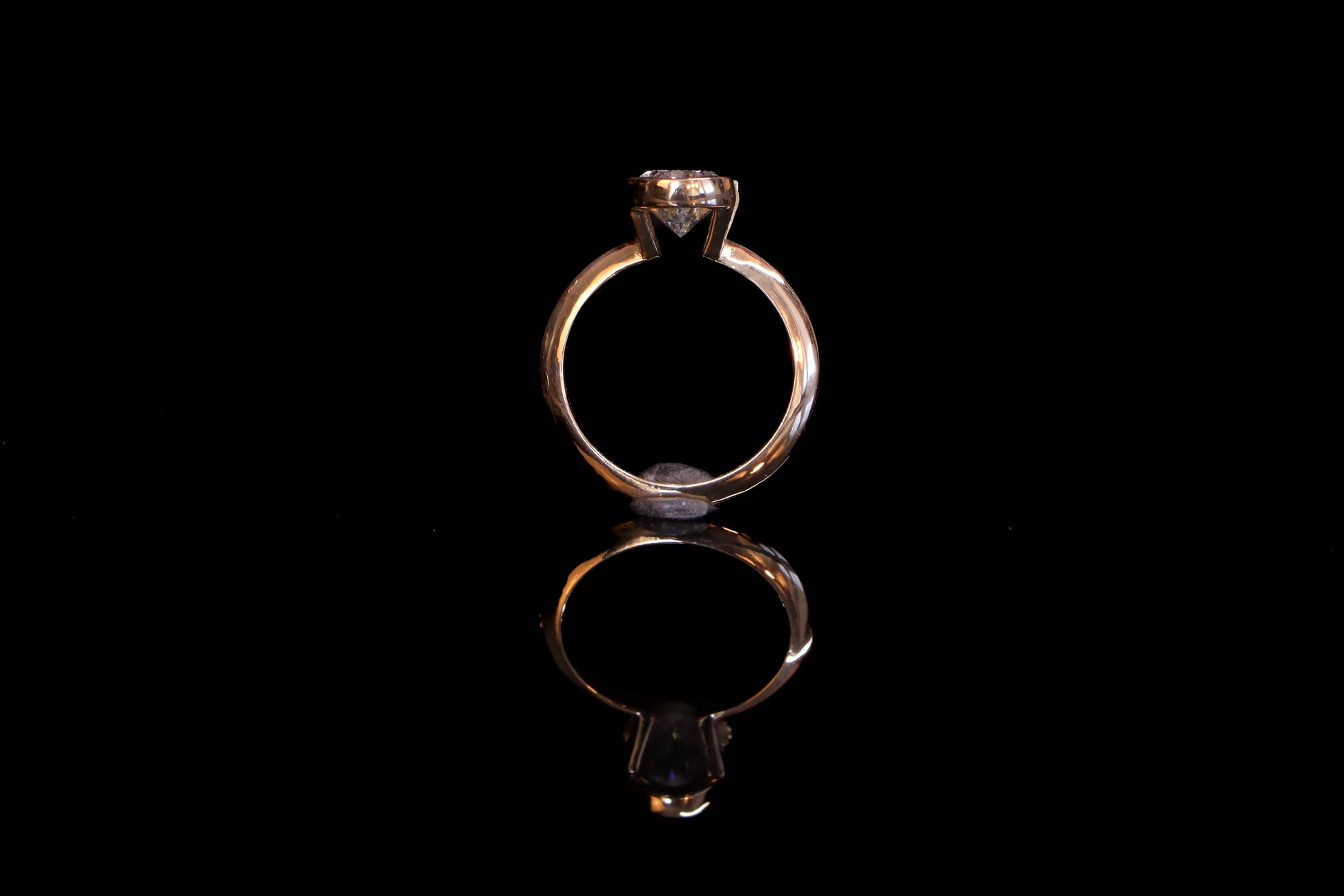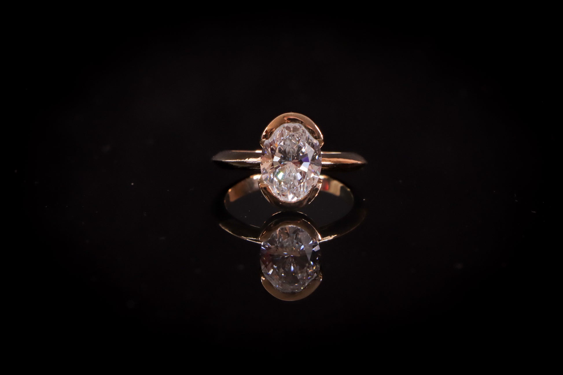 This stunning custom 2.63ct lab diamond solitaire is pure understated elegance. The clean lines and angles of the unique half-bezel setting and knife-edge band provide an edgy, modern twist to the classic solitaire style.
