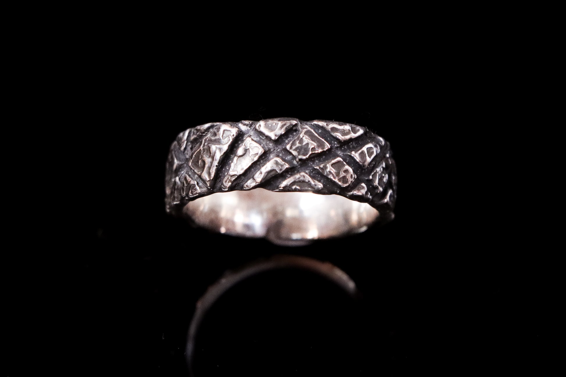 A custom hand carved textured Slashed ring cast in sterling silver.