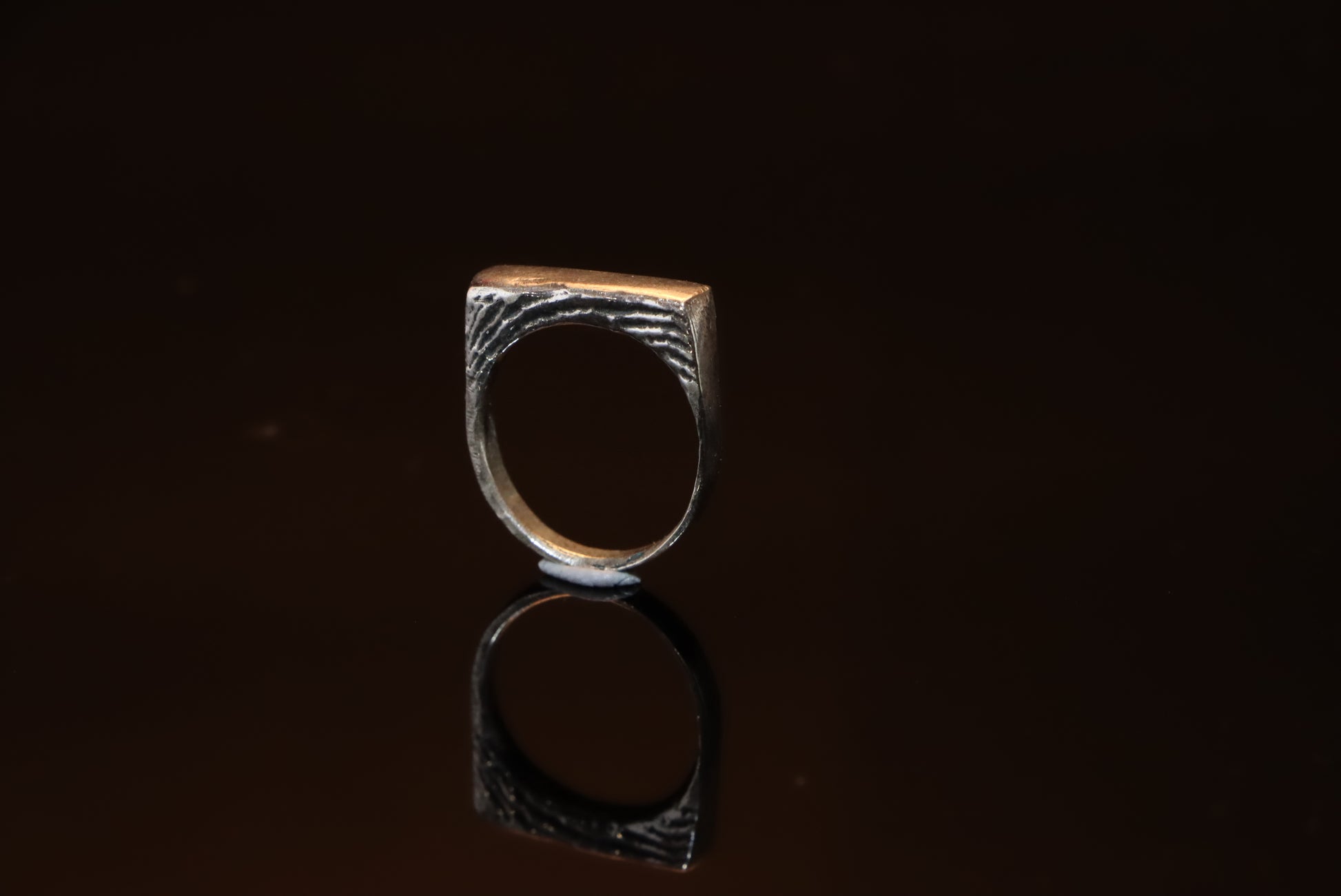 A sleek, polished bar contrasts with the rugged staggered patterns lended to the ring by the cuttlefish bone casting process.