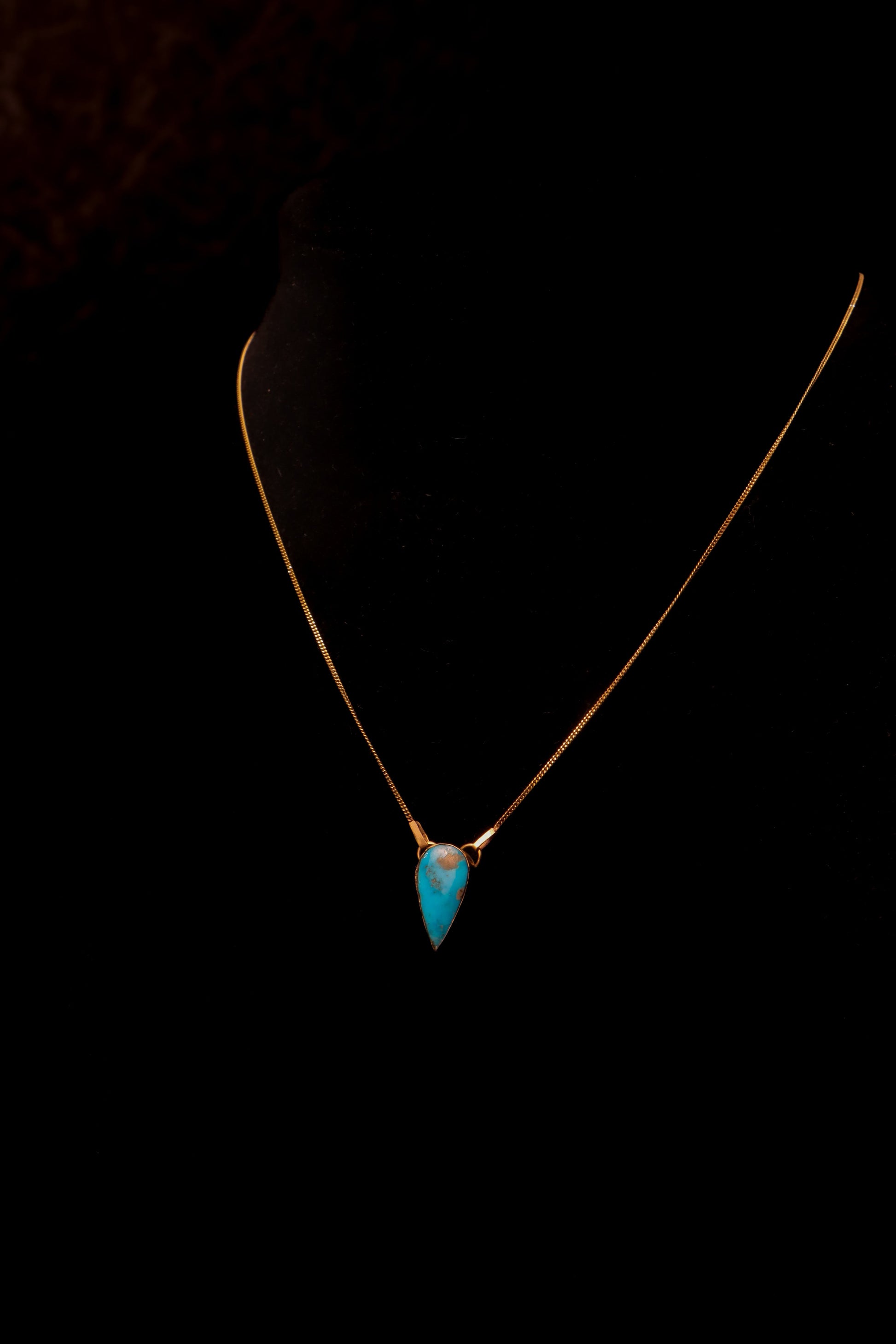 An inverted teardrop cut Persian Turquoise showcased in a 14k yellow gold bezel and chain.