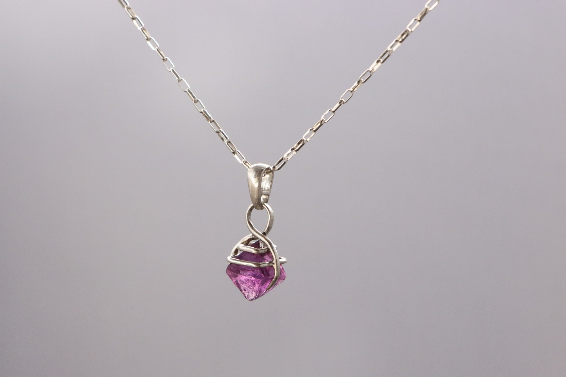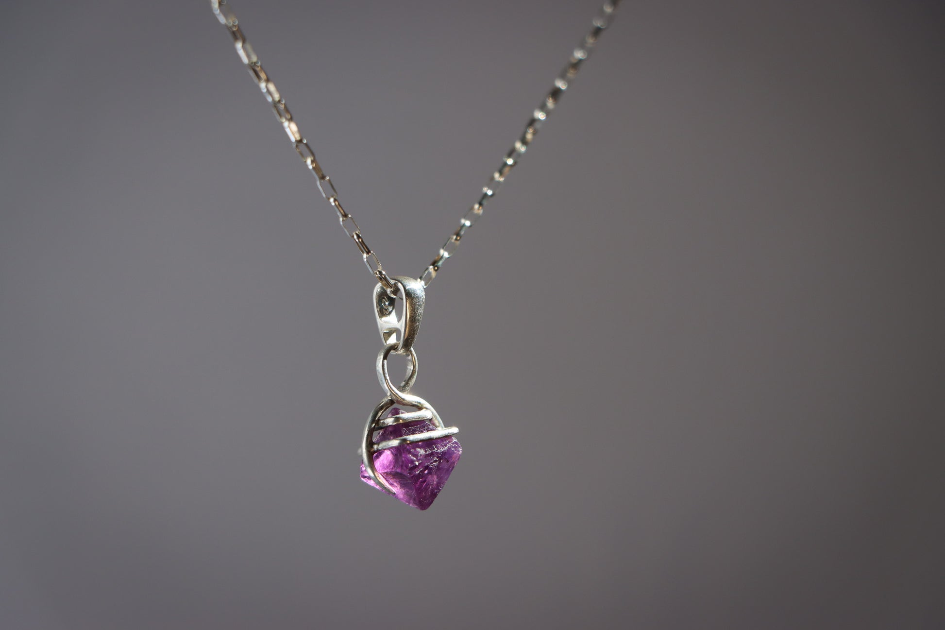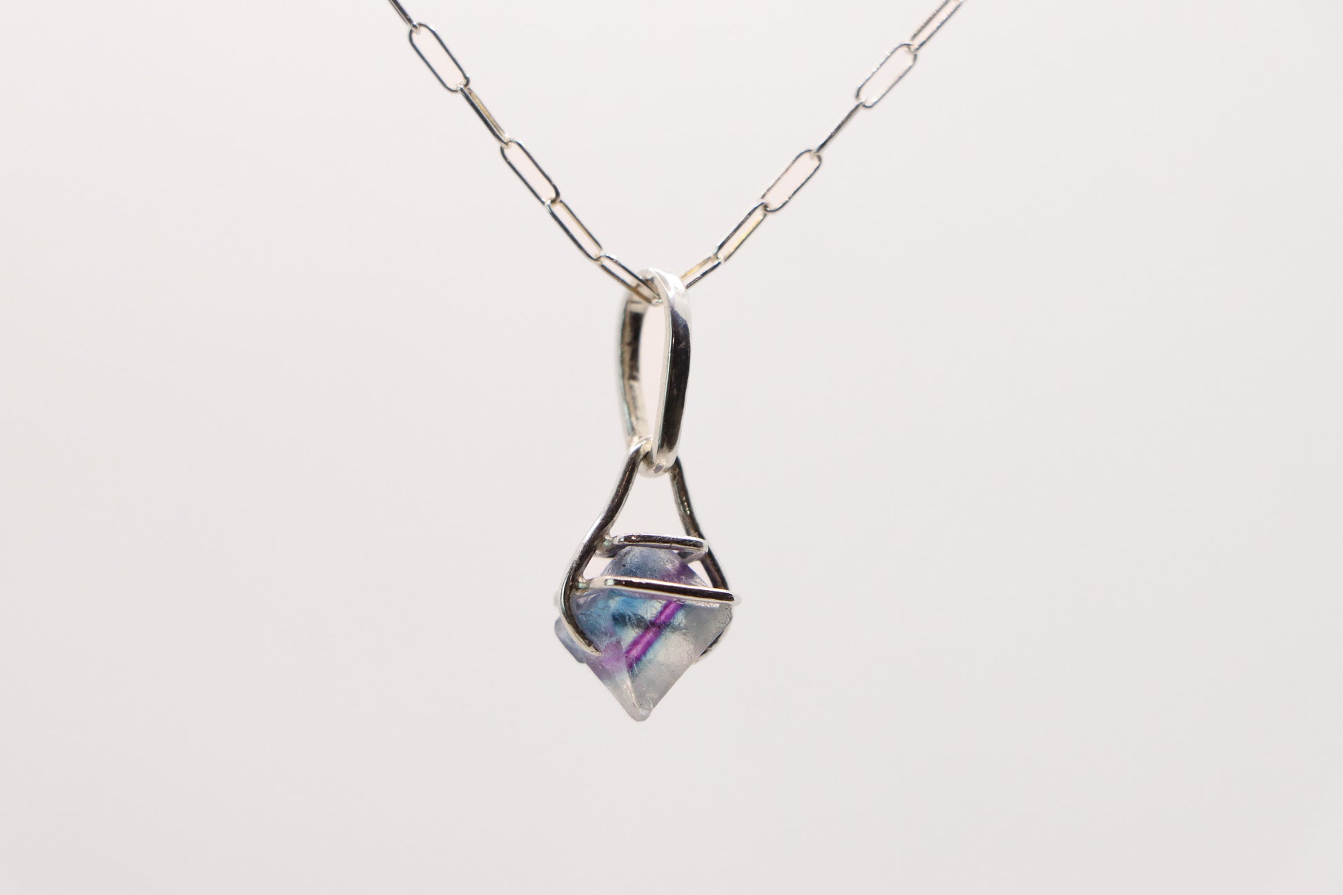 A natural Fluorite crystal set in a handmade sterling silver claw setting.