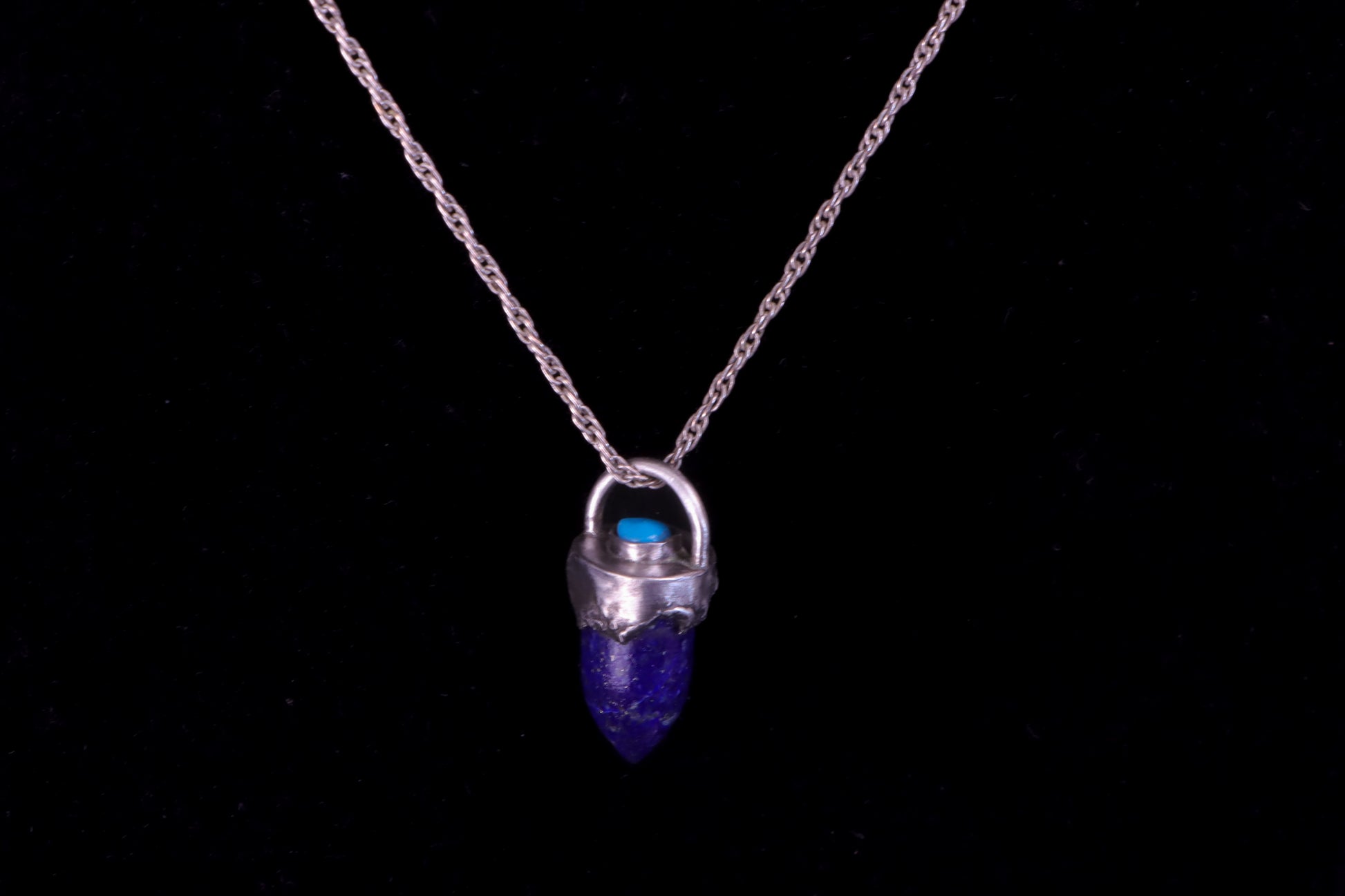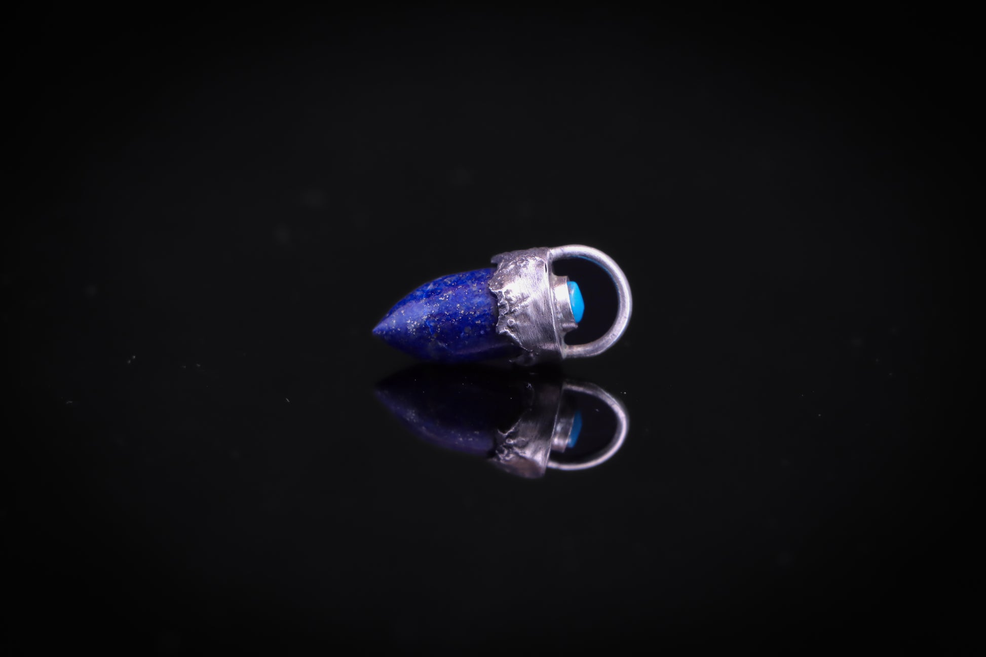 A bullet shaped Lapis Lazuli paired with a small Kingman Turquoise nugget, encased in a handmade sterling silver reticulated casing.