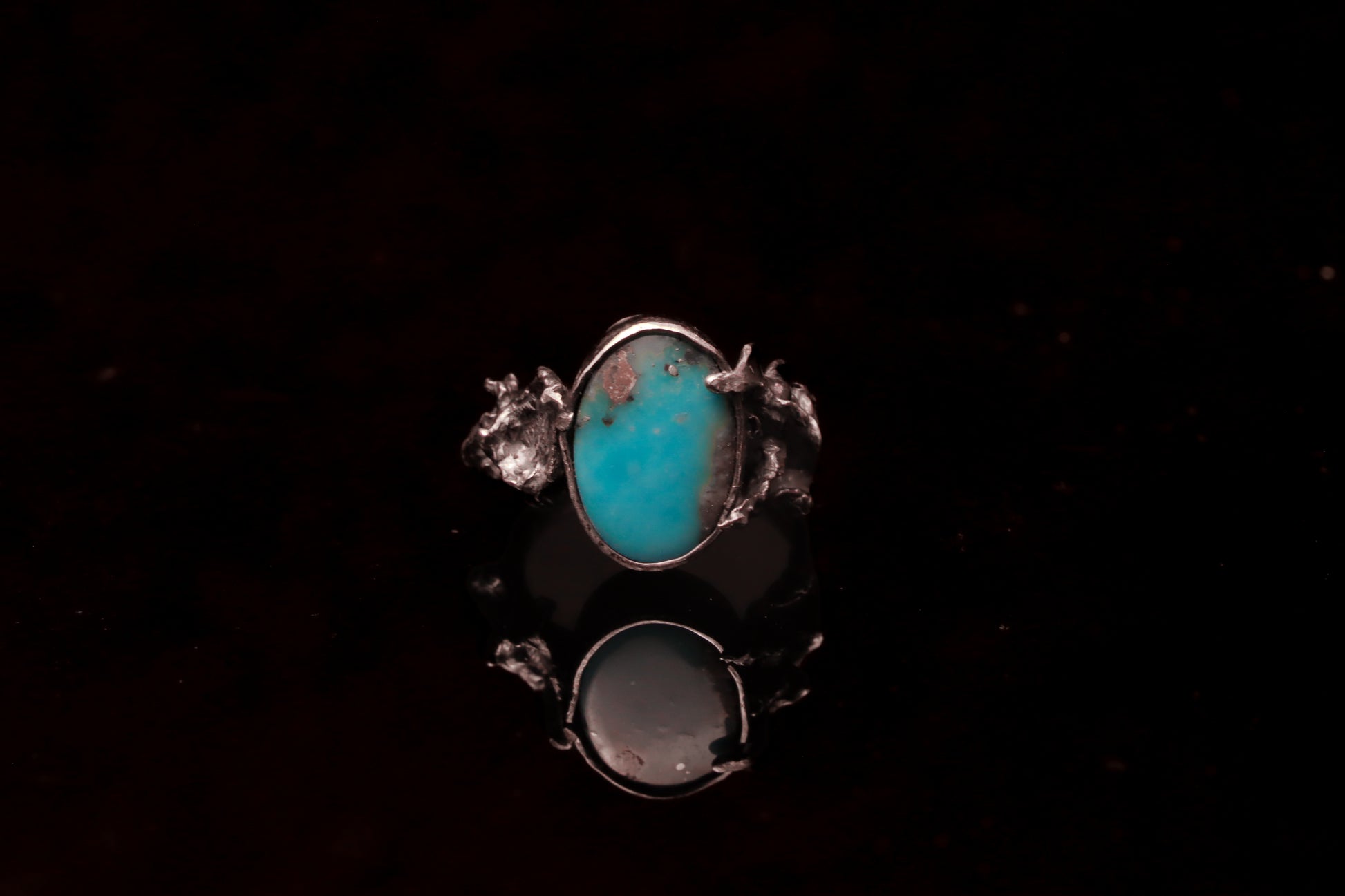 A one-of-a-kind sterling silver statement ring featuring a Persian Turquoise encased with water cast embellishments on a comfort-fit band. This ring is a size 8.