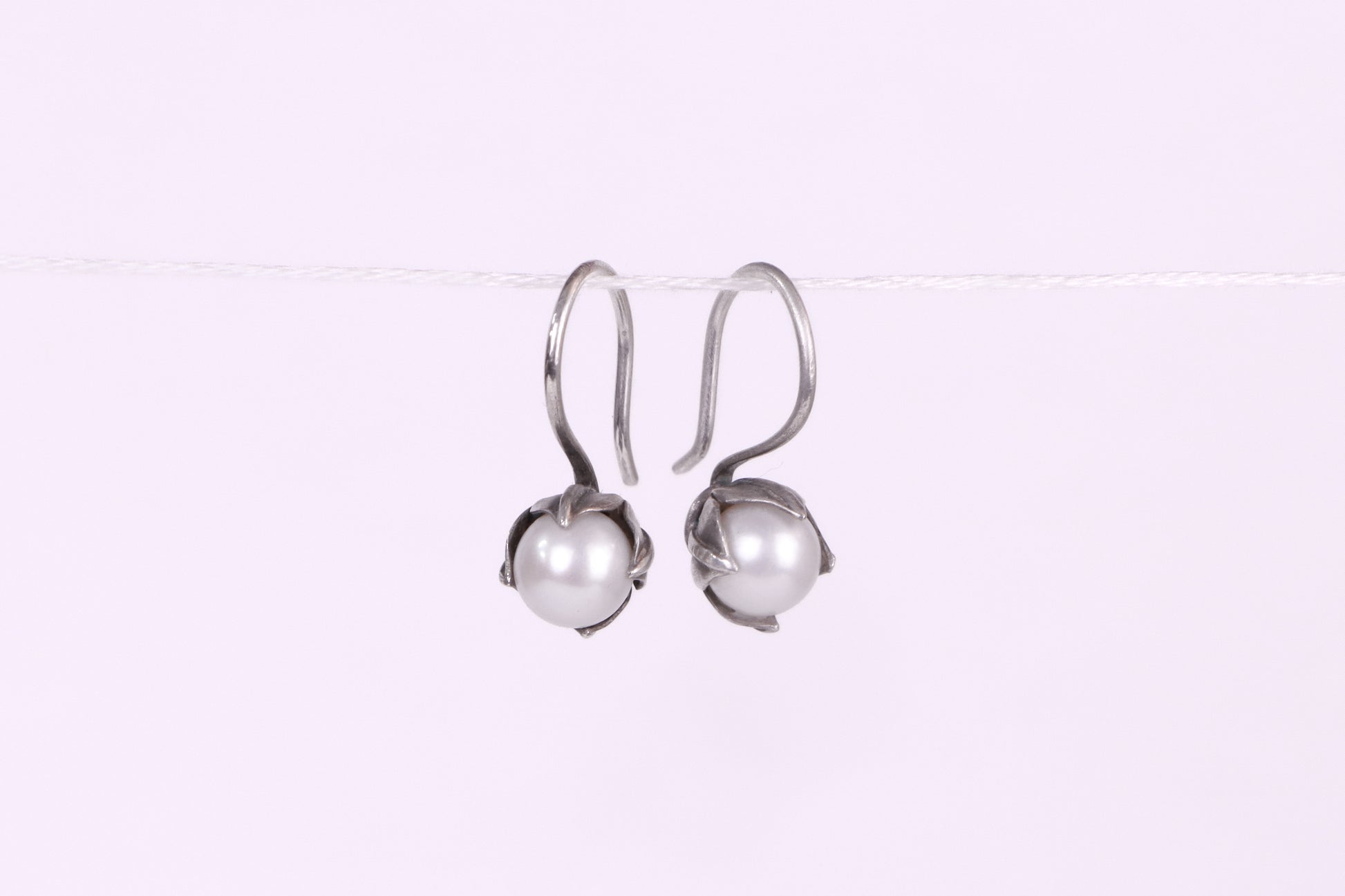 White Pearl drop earrings nestled between handmade sterling silver leaves.