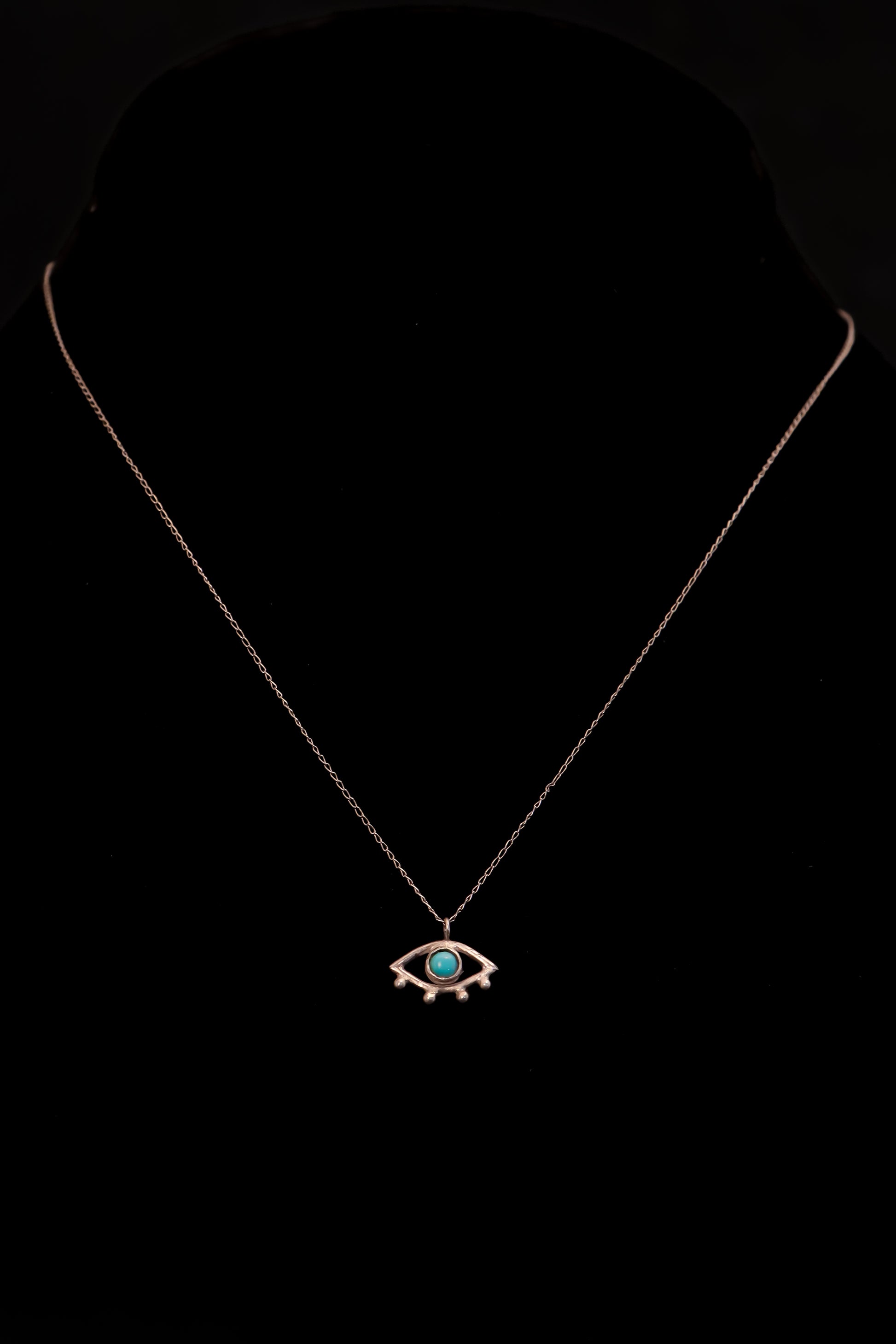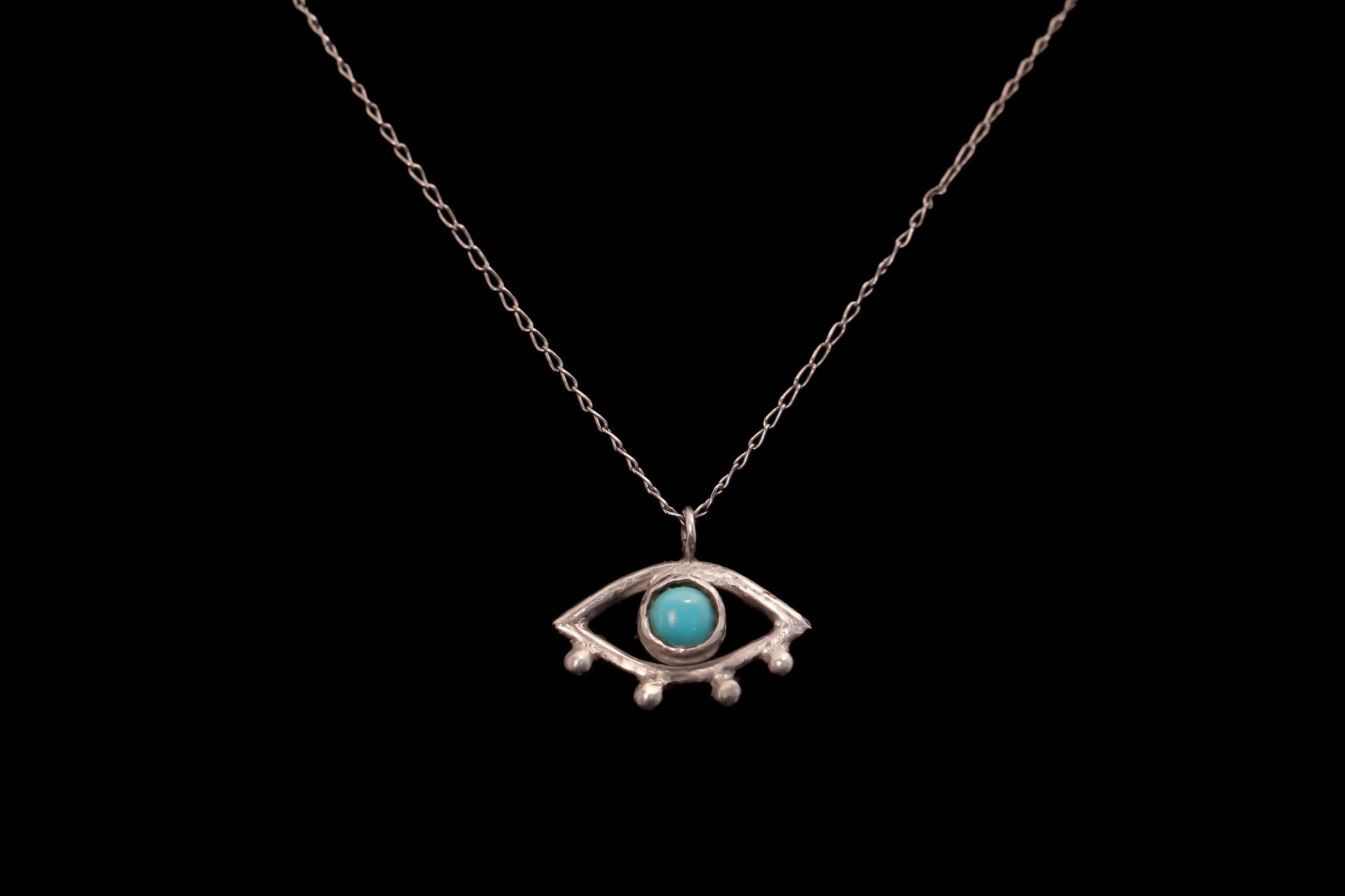 A sterling silver Evil Eye pendant with a round Persian Turquoise. Available with or without 16" sterling silver chain.