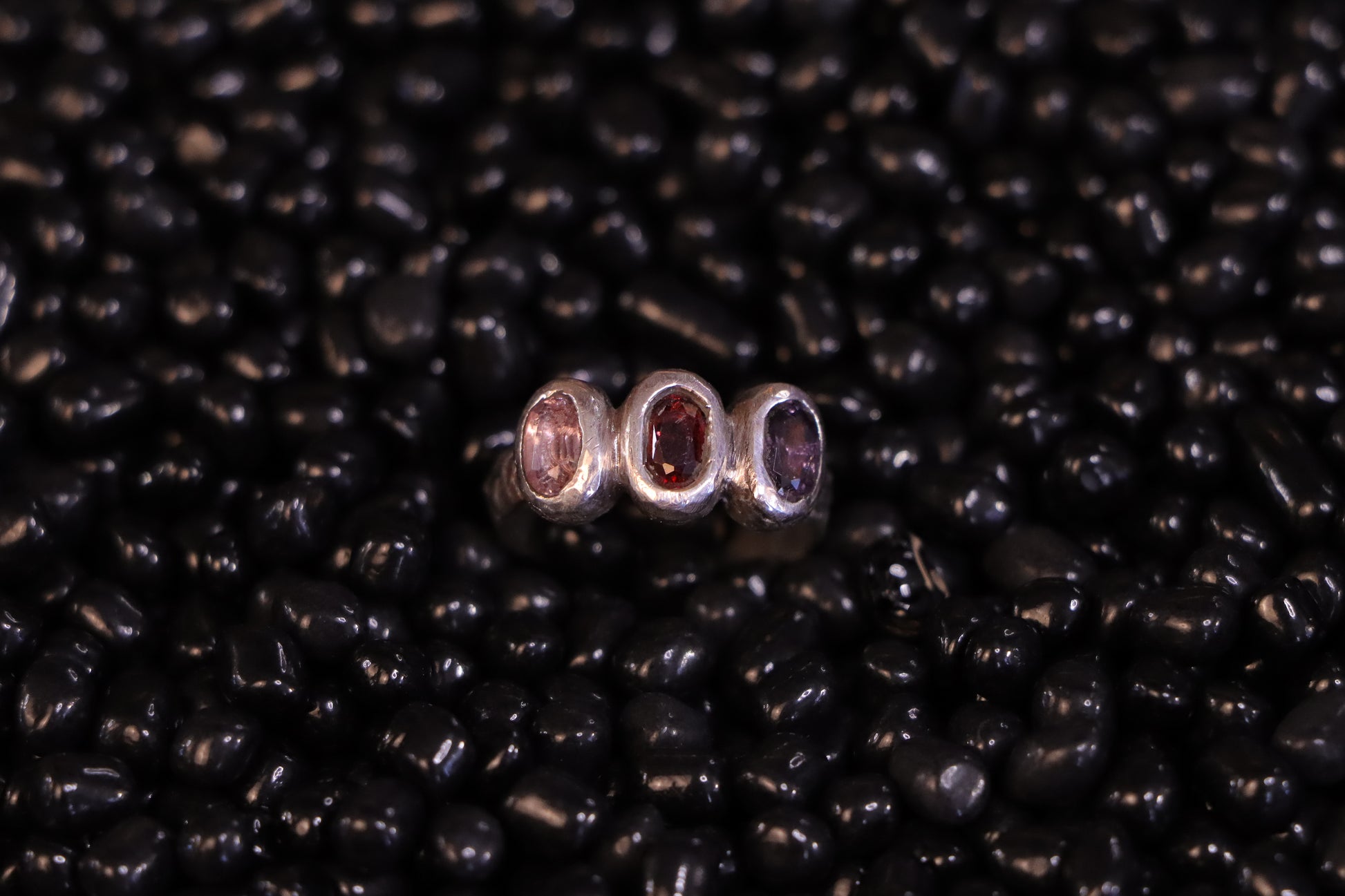 A captivating 3-stone ring featuring 3 gorgeous oval-cut spinels on a hand-carved and cast textured sterling silver band. This ring is a size 6.5.