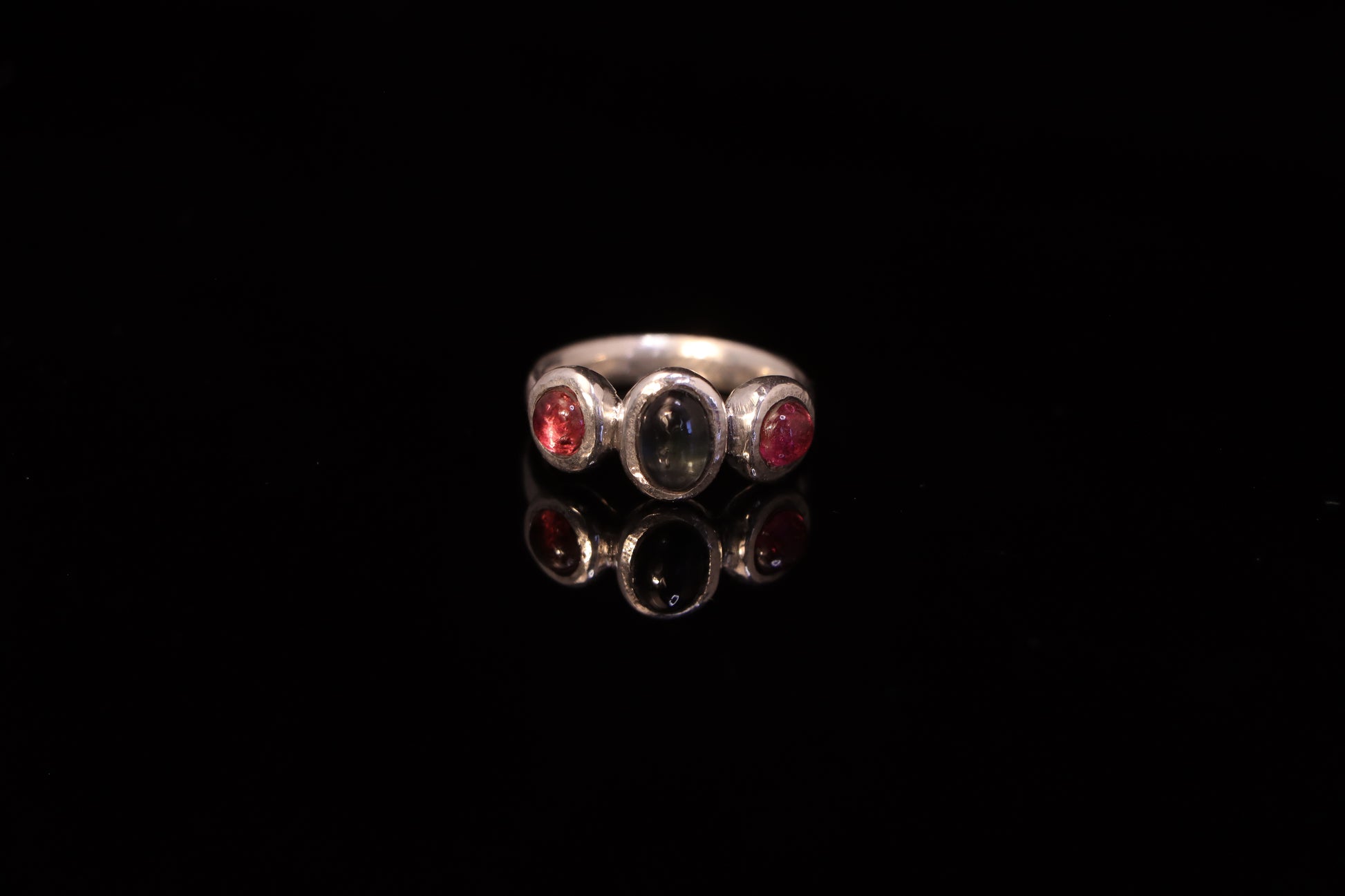A hand-carved sterling silver 3-stone ring featuring an Indicolite Tourmaline center stone and pink Tourmaline side stones. This ring is a size 7.