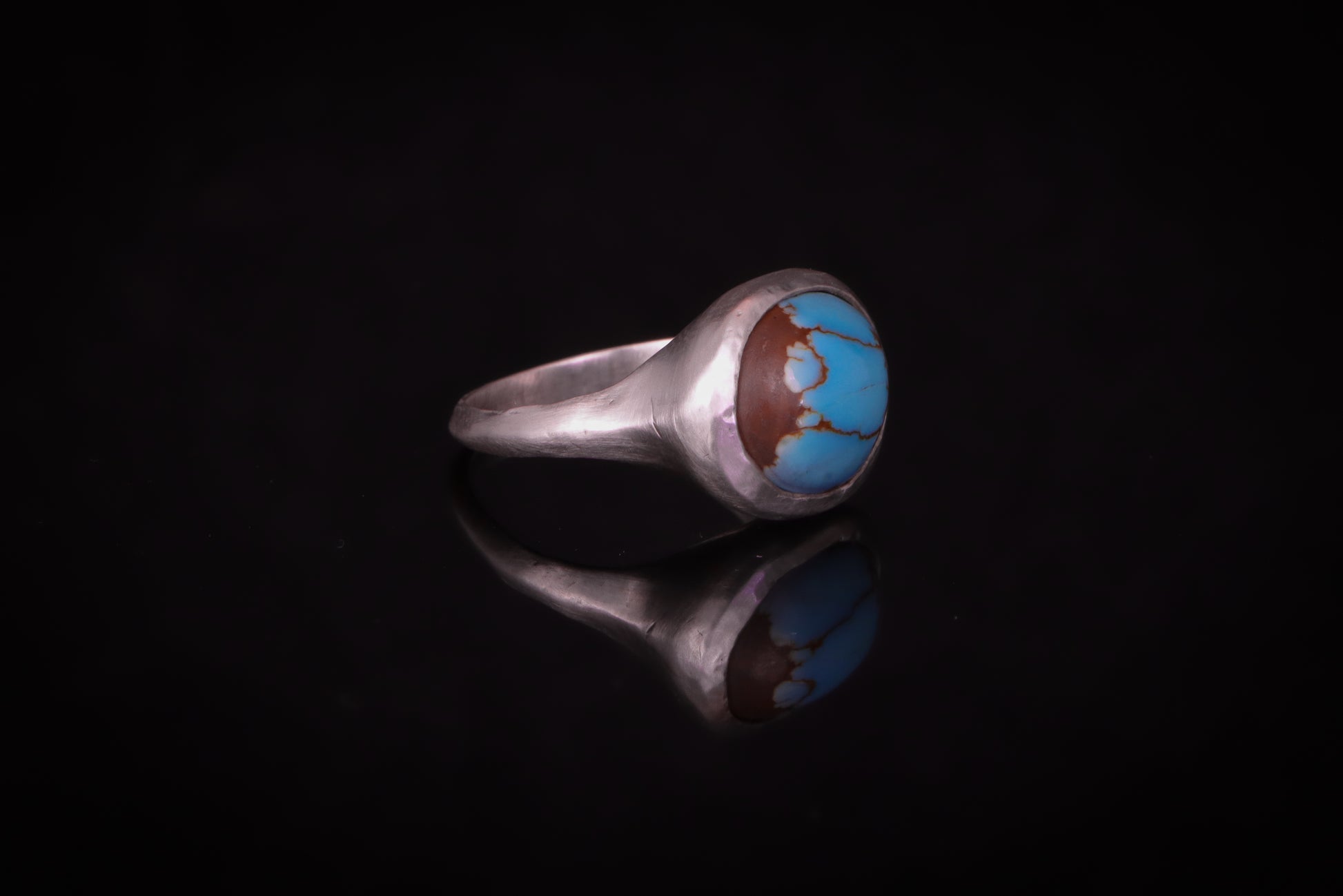 A No.8 Turquoise set in a hand-carved ring featuring a knife-edge band and a subtle brushed finish.